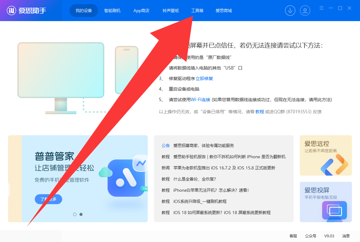 3.打开爱思助手,点击“工具箱->iTunes 及驱动->安装 iTunes”来安装 iTunes